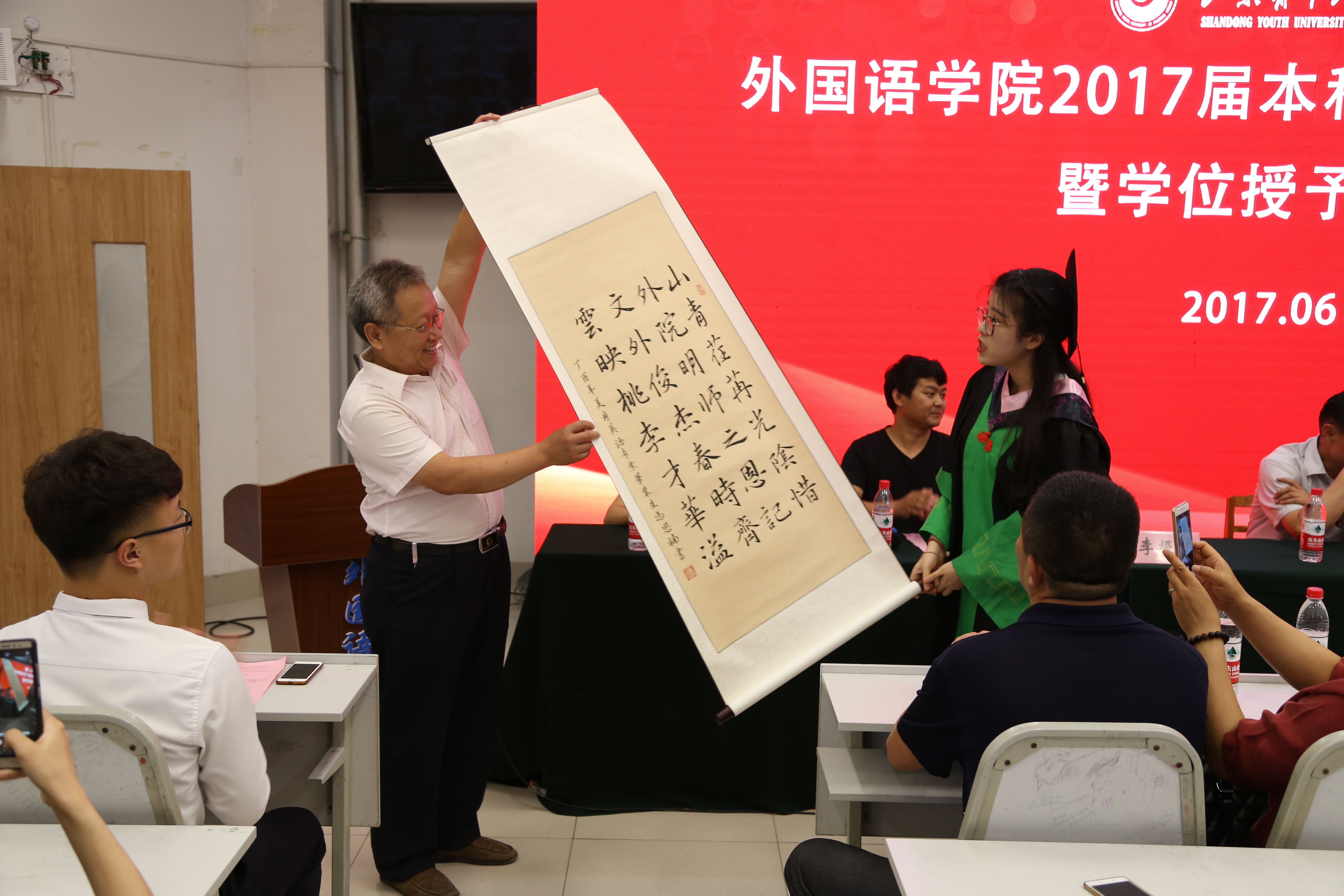 英语教研室副主任张金将典礼发言作为送给毕业生的最后一堂课,他说,毕业典礼在英语中叫做commencement,但这个单词的本义为“开始”,这个看似矛盾的表达实则耐人寻味。今天不仅是庆祝“大学学业的结束”,更是欢呼“新的人生征程的开启”。优秀毕业生代表杨盼盼在毕业演讲中几度哽咽,她即将踏上通往天津外国语大学研究生院的新征程,却难舍山青、难忘外院,专业课堂的锻炼、辅导员的关爱、映湖水畔的晨读、图书馆晚归的小路、舌尖上的“饼加肠加蛋”,构成了属于她和山青的独家记忆。优秀在校生代表周紫薇表示要向毕业生看齐,继承优良学风,再创外院辉煌。西班牙语外教Yurgen热情洋溢的讲话和家长代表于晖先生情真意切的话语,引起毕业生强烈共鸣。英语专业毕业生冯思楠赠送其书法作品表达对母校的无限感激以及对同窗的依依惜别之情。