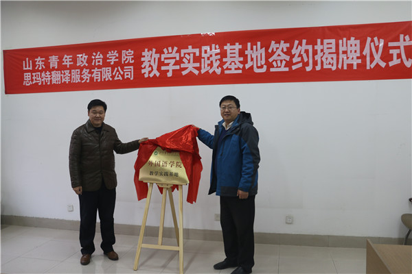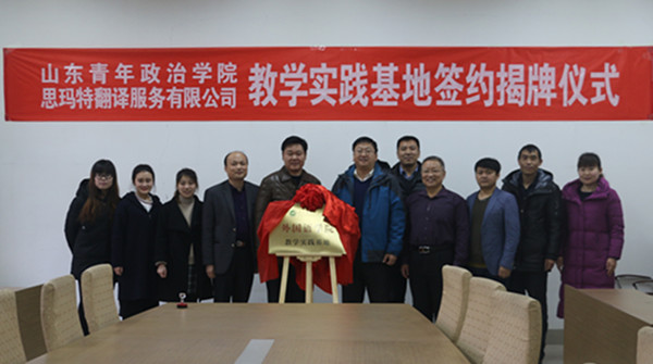 近日,山东青年政治学院思玛特翻译服务教学实践基地签约揭牌仪式在外国语学院会议室402举行。外国语学院院长卢杰、党总支书记李振杰、党总支副书记衣海永、副院长邵光庆、英语教研室主任冯德河以及部分学生代表参加了签约仪式。