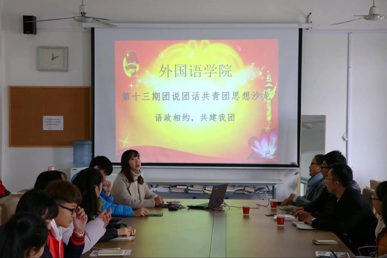 11月22日中午,外国语学院举办第十三期“团说团话”共青团思想沙龙。本期活动以“语政相约,共建我团”为主题,通过轻松愉悦的分享交流形式展开。政治与公共管理学院“正青春”团支部工作研究会、2016级学生团干部代表作为嘉宾应邀出席,外国语学院2016级优秀学生团干部参加活动。