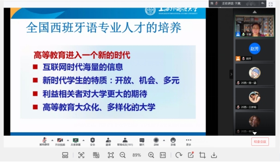 11月25日下午,由外国语学院主办的国别区域与语言应用研究暨外国语语言文学论坛(第十一期)在线上举行。上海外国语大学西方语系主任、西班牙语专业博士生导师于漫教授应邀做了主题为“规划与提升:新环境下的西班牙语专业学习”的讲座。本次论坛由外国语学院西班牙语专业负责人赵芳主持,外国语学院副院长管秀兰教授、西班牙语专业全体师生参加。