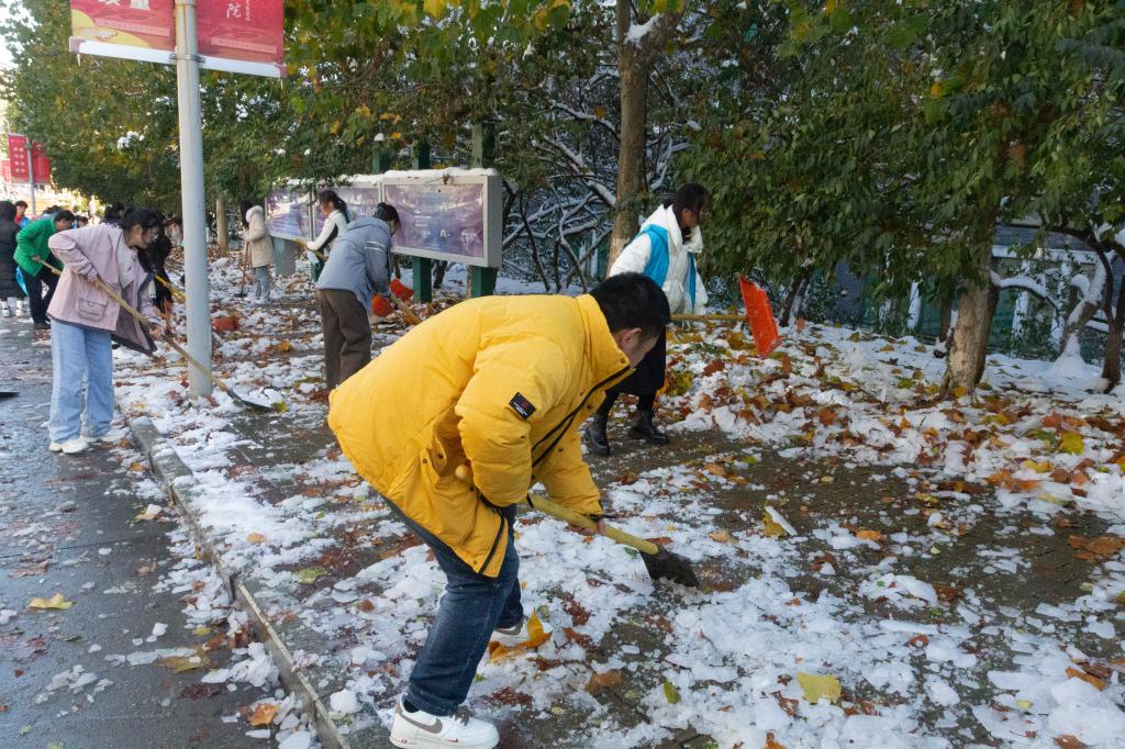 为贯彻落实学校《关于全面加强新时代大学生劳动教育的实施意见》文件精神,培养德智体美劳全面发展的社会主义建设者和接班人,加大劳动教育力度,11月8日中午,外国语学院因地制宜,主动组织2021级英语专业40余名师生齐聚校史馆门前,开展背阴路面清雪除冰攻坚校园劳动。学校党委委员、副院长李玉英莅临现场指导工作。