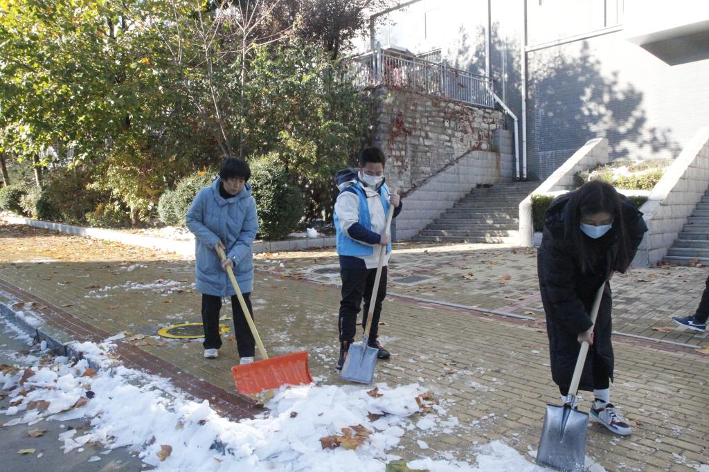 在劳动教育课授课老师的带领下,同学们拿着铁锹、清雪铲等工具以饱满的热情投入劳动中,奔赴各自所分配区域,不畏严寒、努力争先、协作互助,迅速进入状态。寒冷刺骨的天气、潮湿打滑的路面、树顶滴落的雪水均没有影响到学生们的工作效率和劳动干劲,有的女生冻得双手通红,有的男生承担大量收尾工作,但均没有叫苦喊累或者悄然离场。经过1个多小时的奋战,基本清除了预期目标区域内的积雪和坚冰,开辟出一条安全通畅的道路。