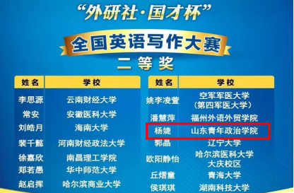 在近日结束的“外研社杯”全国大学生英语写作大赛全国总决赛中,我校2019级英语专业学生杨婕获得二等奖,指导教师张丽君获优秀指导教师奖。