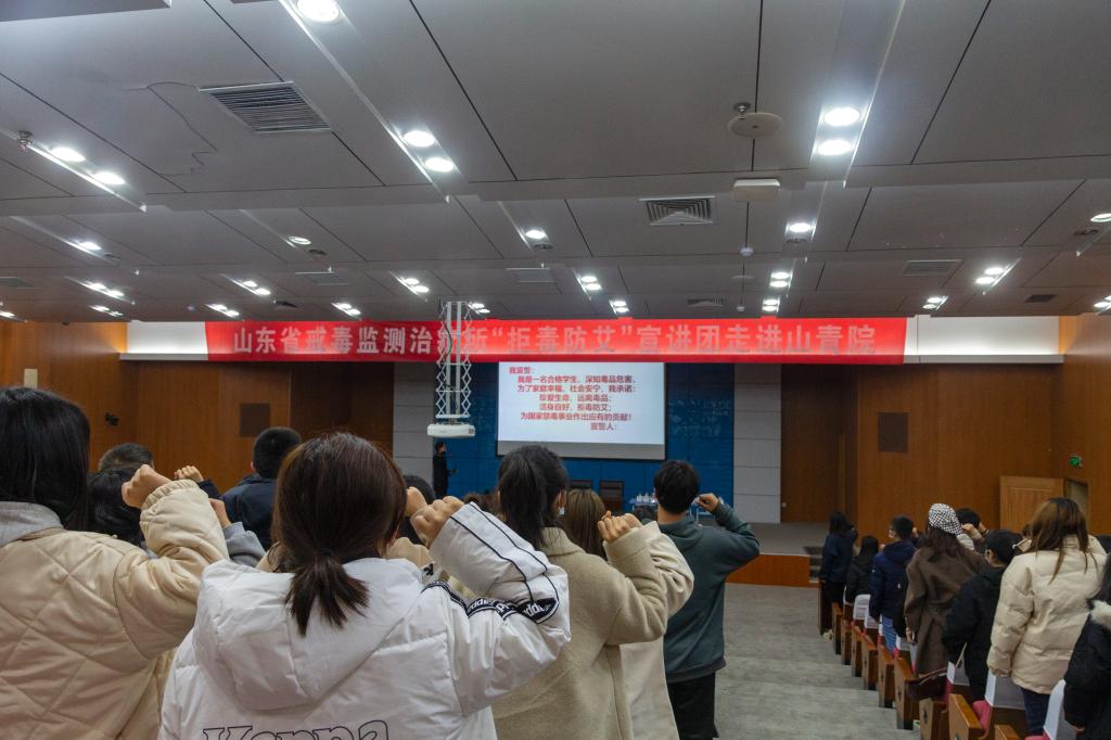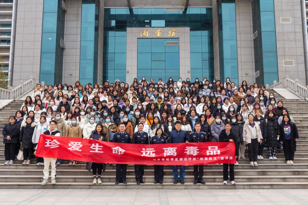 为进一步深化学校禁毒预防教育,引导师生树立禁毒防艾健康理念,增强抵御毒品侵害的能力和主动参与禁毒斗争的意识,提高预防艾滋病教育的针对性和实效性,近日,学校邀请山东省戒毒监测治疗所“拒毒防艾”宣讲团进校开展禁毒防艾主题宣讲活动。山东省戒毒监测治疗所党委委员、副所长孙玉梅,教育矫正中心主任沈群,政治处副主任袭越,专管二大队四级警长何鹏飞来校,学校后勤管理处副处长李辉来、外国语学院党委副书记崔师锐及外国语学院师生代表参加活动。