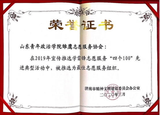 自成立以来,雏鹰志愿服务协会先后获新华网、央广网、中国山东网、山东教育、今日头条、山东频道、大众网等多家媒体报道,并为学校赢得“青年企业家创新发展国际峰会突出贡献合作单位”荣誉称号。2019年,雏鹰协会获得由校学生工作部(处)奖励颁发的志愿服务专项资助,并在2019年度济南市五四出彩典型评选中获评“出彩型青年志愿服务集体”,2020年获评济南市“四个100”最佳志愿服务组织,社团指导教师获山东省志愿服务“四个100”最美志愿者荣誉称号。