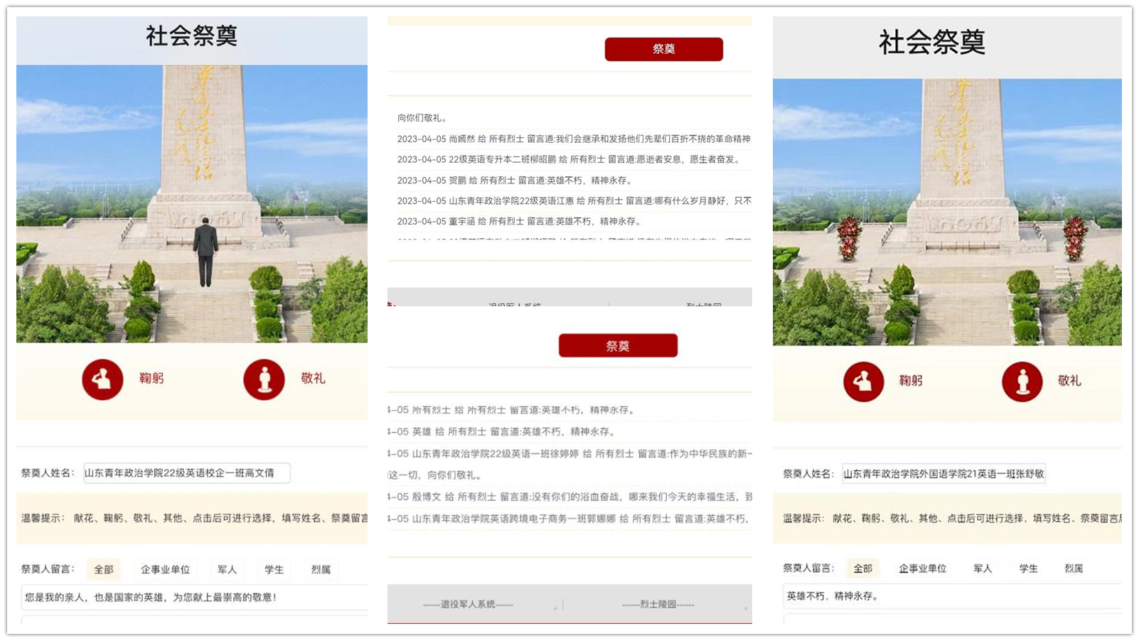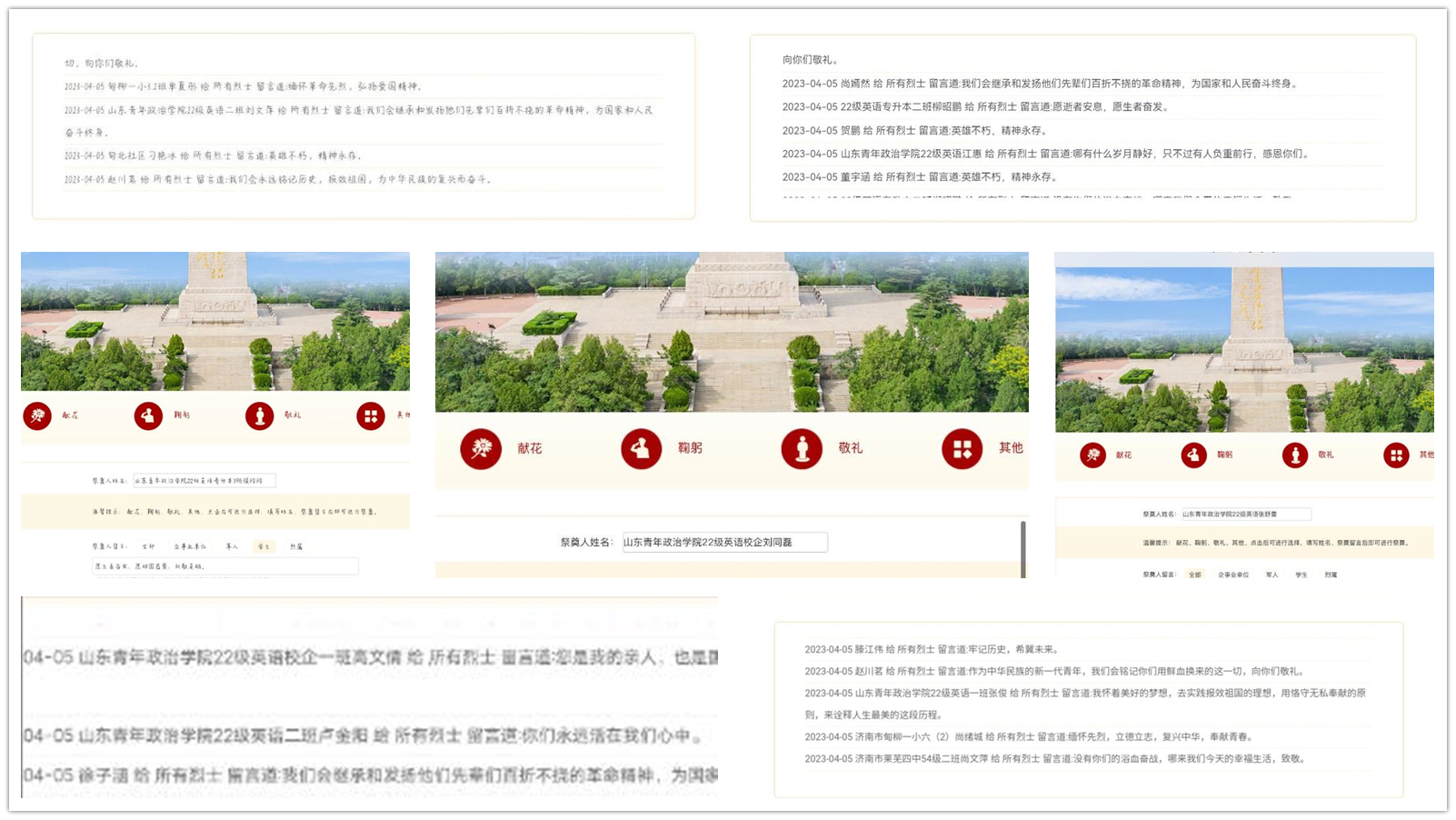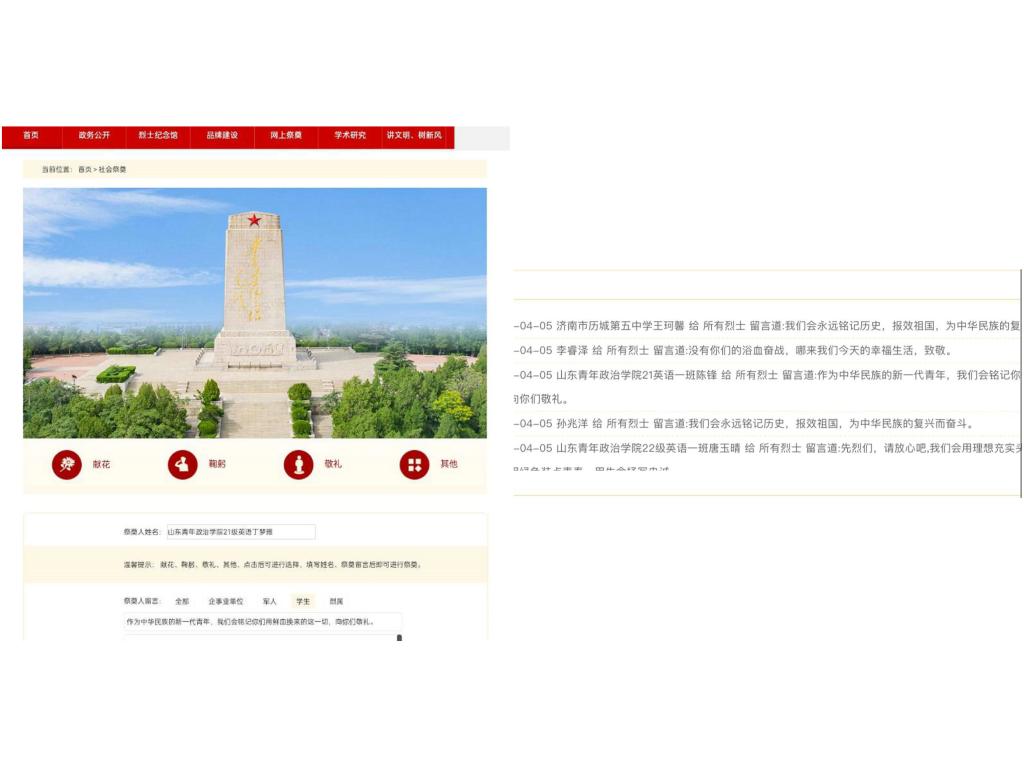 青山绿水常留生前正气,苍松翠柏堪慰逝后英灵。在济南革命烈士陵园线上云祭扫平台,学生们先是通过红色故事分享会聆听了“甘洒热血写春秋——记为军队建设献身的好师长”、“忠勇为党尽,热血洒鲁北”等事迹,感受革命先烈们早期为创建理想家园、卫国戍边的艰苦奋斗历程。而后在虚拟革命烈士纪念碑前,通过低头默哀、敬献花束、鞠躬敬礼等不同形式为革命先烈寄托崇高敬意和深切哀思。同时在虚拟烈士纪念碑前留言缅怀,青年学子以掷地有声的承诺表达初心不渝。