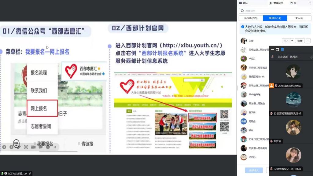 青年当有志,立志为四方。为贯彻落实党的二十大精神,鼓励学生感恩回馈社会,增进同学们对国家西部计划的理解,外国语学院于10月14日举办“到西部去,绽放青春之花西部计划”主题线上分享会。本次分享会邀请2023届西部计划志愿者,2019级英语专业陈皓然、法语专业陈万芳分享个人志愿经历,外国语学院辅导员彭梦迪主持,学院部分学生参加。