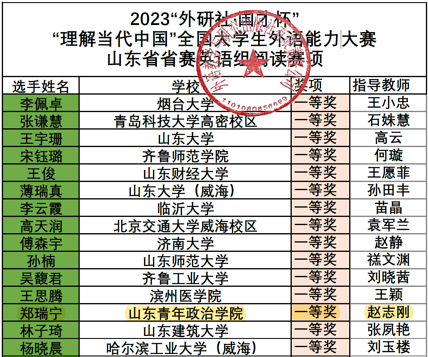 在近日结束的2023“外研社·国才杯”“理解当代中国”全国大学生外语能力大赛山东省省赛中,我校派出的10名英语组选手获得8个奖项。其中,英语专业学生郑瑞宁获阅读大赛一等奖并进入全国总决赛,朱雅茹(政治学与行政学专业)获阅读大赛三等奖,张浩云(英语专业)、唐美娜(计算机科学与技术专业)获演讲大赛三等奖,宋洁(经济学专业)获写作大赛三等奖,另有三位选手获优胜奖。