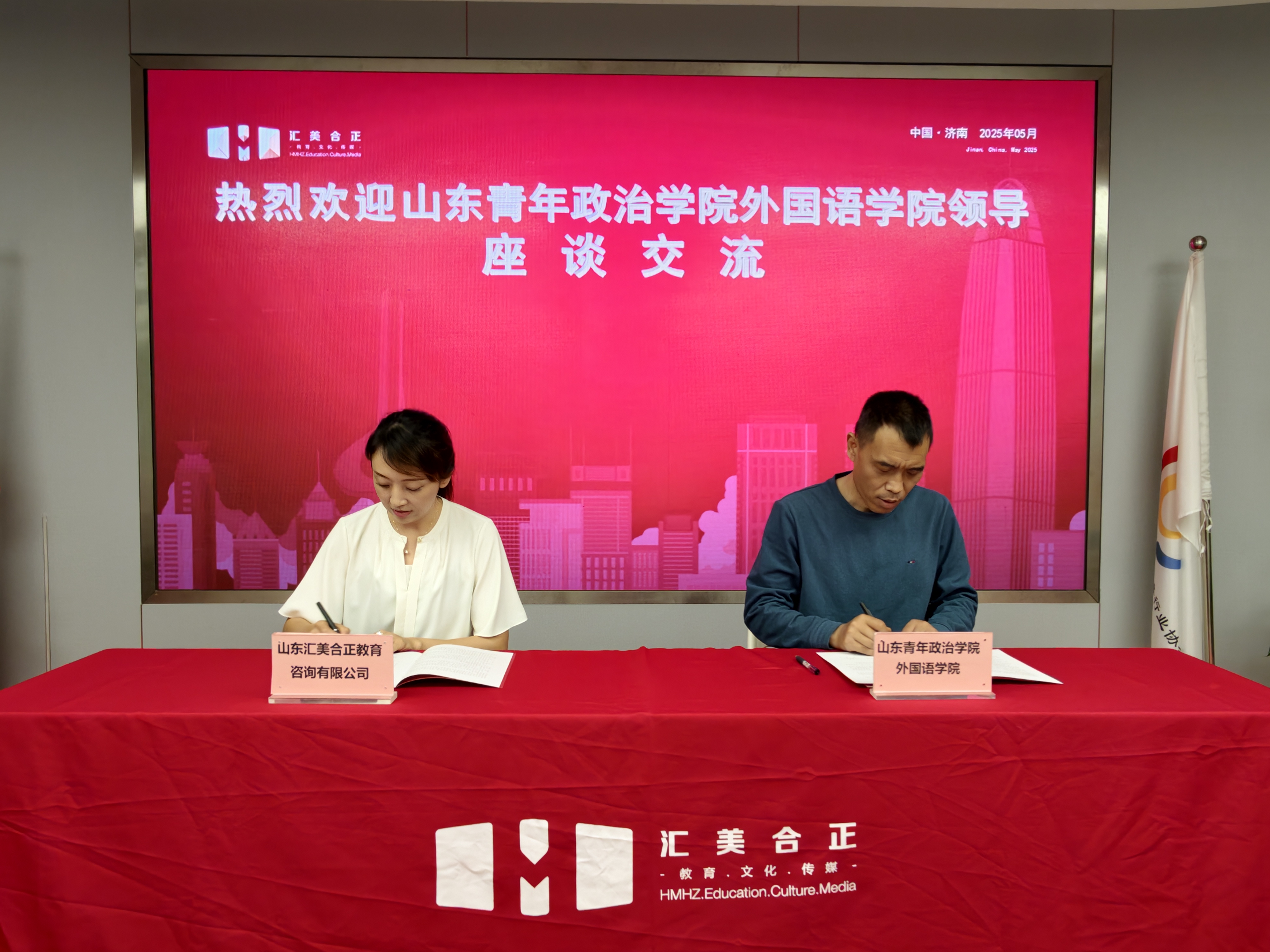 座谈会上,冯德河表示,此次与汇美合正教育集团共建就业实习基地,是学院积极拓展优质实践平台、着力提升学生就业核心竞争力的关键举措。他指出,汇美合正教育集团在行业内拥有深厚的积淀和丰富的优质资源,这些资源将为学生提供宝贵的实战锻炼机会,助力学院实现人才培养与产业需求的精准对接,推动应用型外语人才培养质量的提升。于志浩对外国语学院一行的到来表示热烈欢迎。他表示,集团高度重视与高校的合作,始终将人才培养作为重要战略方向。期待通过与外国语学院的合作,吸引更多优秀的外语专业学子加入,共同探索教育服务的创新模式,提升教育服务品质,实现校企双方的互利共赢。双方还围绕未来实习安排、课程共建等具体事宜进行了细致交流,达成多项共识。