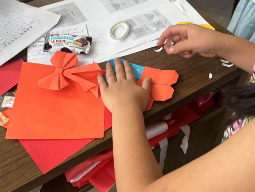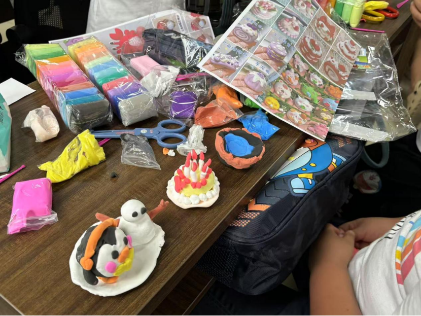 剪纸课上,彩纸在志愿者指导下变成窗花、小动物,孩子们专注地跟着步骤操作,不时互相展示成果;黏土桌前更是热闹,各色黏土被捏成动物、卡通形象,小手上沾着色彩也不在意。互动中,团队通过趣味问卷和交流,了解到孩子们对创意课程的喜爱、假期活动的期待,以及部分孩子缺少陪伴的情况。这些信息与前期资料结合,为后续课程设计提供了精准方向。