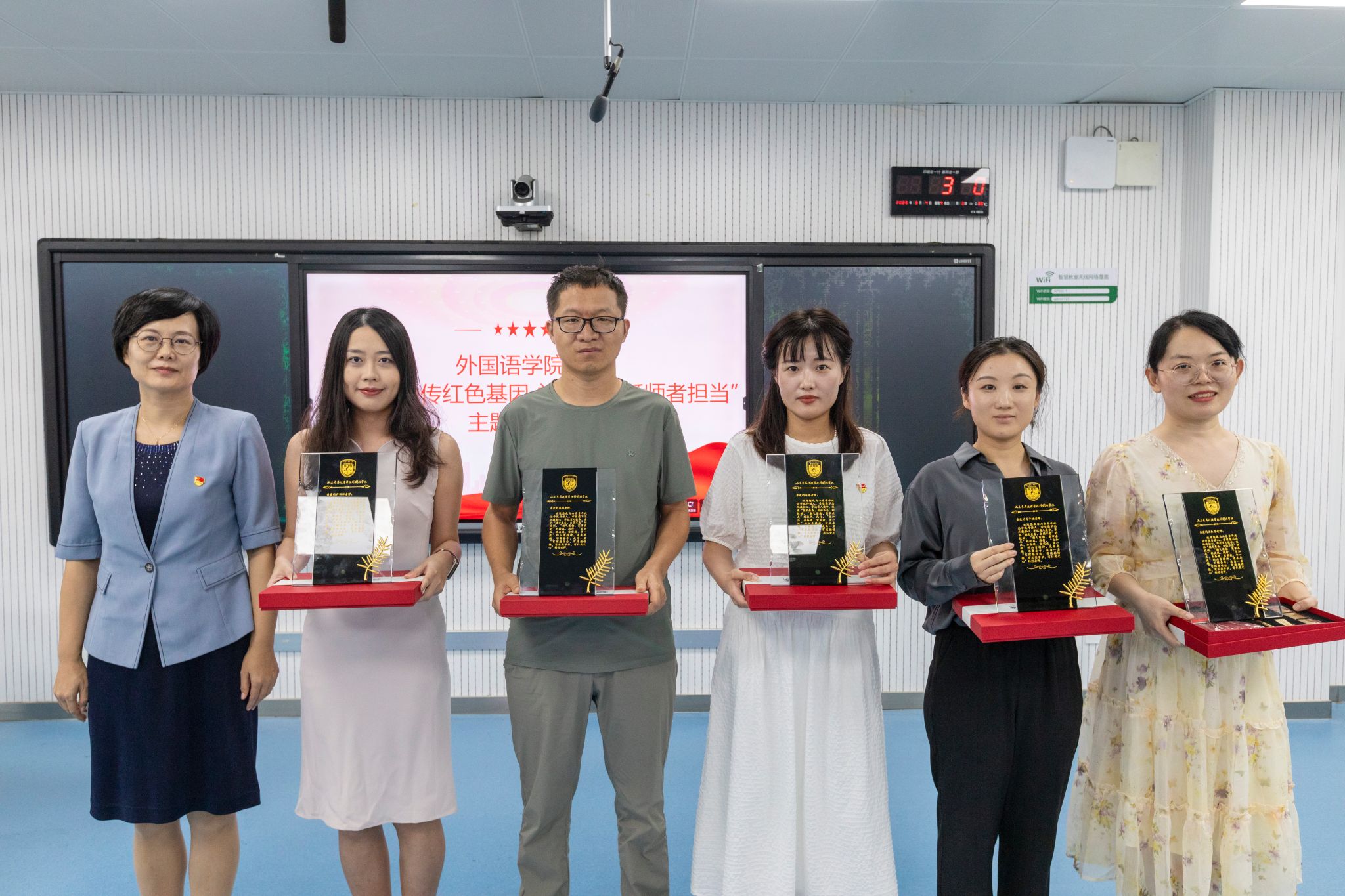 与会领导和教师共同观看“2025年上半年外国语学院大事记”视频。“优秀就业指导教师”代表赵芳结合所在教研室就业指导工作经验和综合业务的推进分享了自己的所思所感。“党员先锋岗”“优秀班主任”代表王爽讲述了自己在工作中的心得体会,为新进教师们完成角色转变、锚定职业目标提供帮助。新进教职工代表许浩表达了对学校和学院提供的发展平台、成长机会以及同事们热情帮助的感恩之情,表示将以优秀前辈为标杆,持续提升自身教学能力与专业素养,为学校事业发展贡献力量。