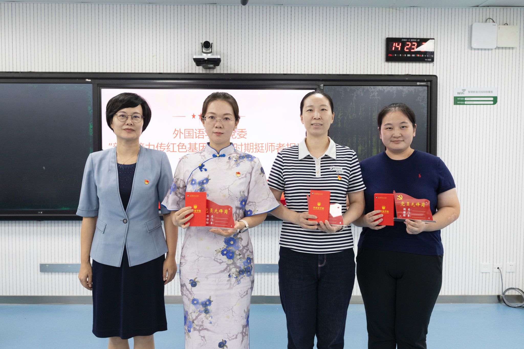 冯素玲为学院“党员先锋岗”教师授予岗位流动红旗,并为新进教职工颁发“外语人”纪念牌。邵光庆、管秀兰、冯德河分别为学院推荐参与学校“优秀班主任”评选的教师、获得“学院优秀考研导师”“学院优秀就业导师”荣誉称号的教师颁发荣誉证书。