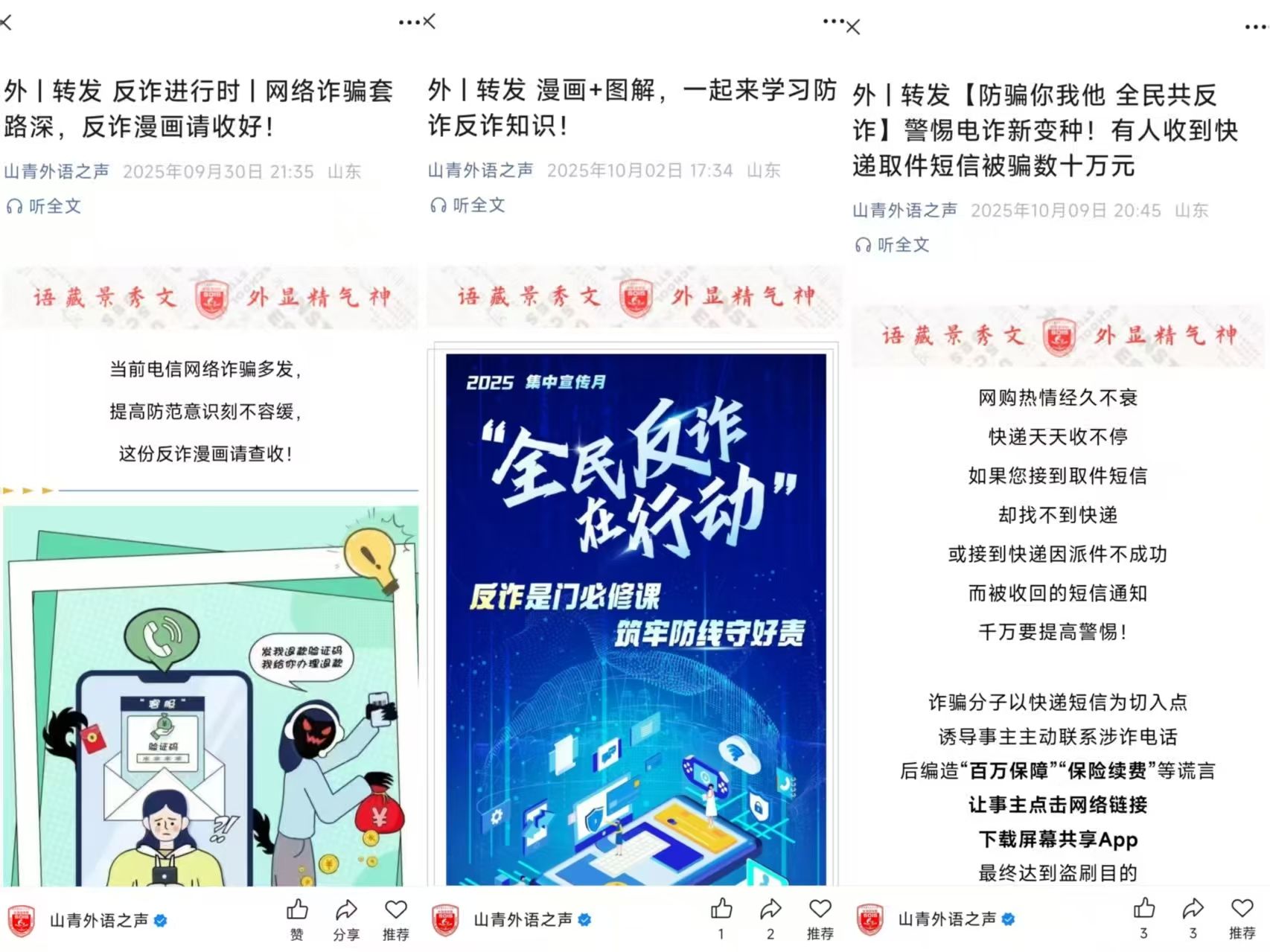 一直以来,外国语学院高度重视学生安全稳定工作,始终将守护学生安全作为工作重中之重。下一步,学院将以此次系列反诈活动为契机,进一步完善校园安全教育体系,不断提升学生的防骗免疫力与风险应对能力,切实筑牢校园安全屏障,为同学们的平安成长保驾护航。