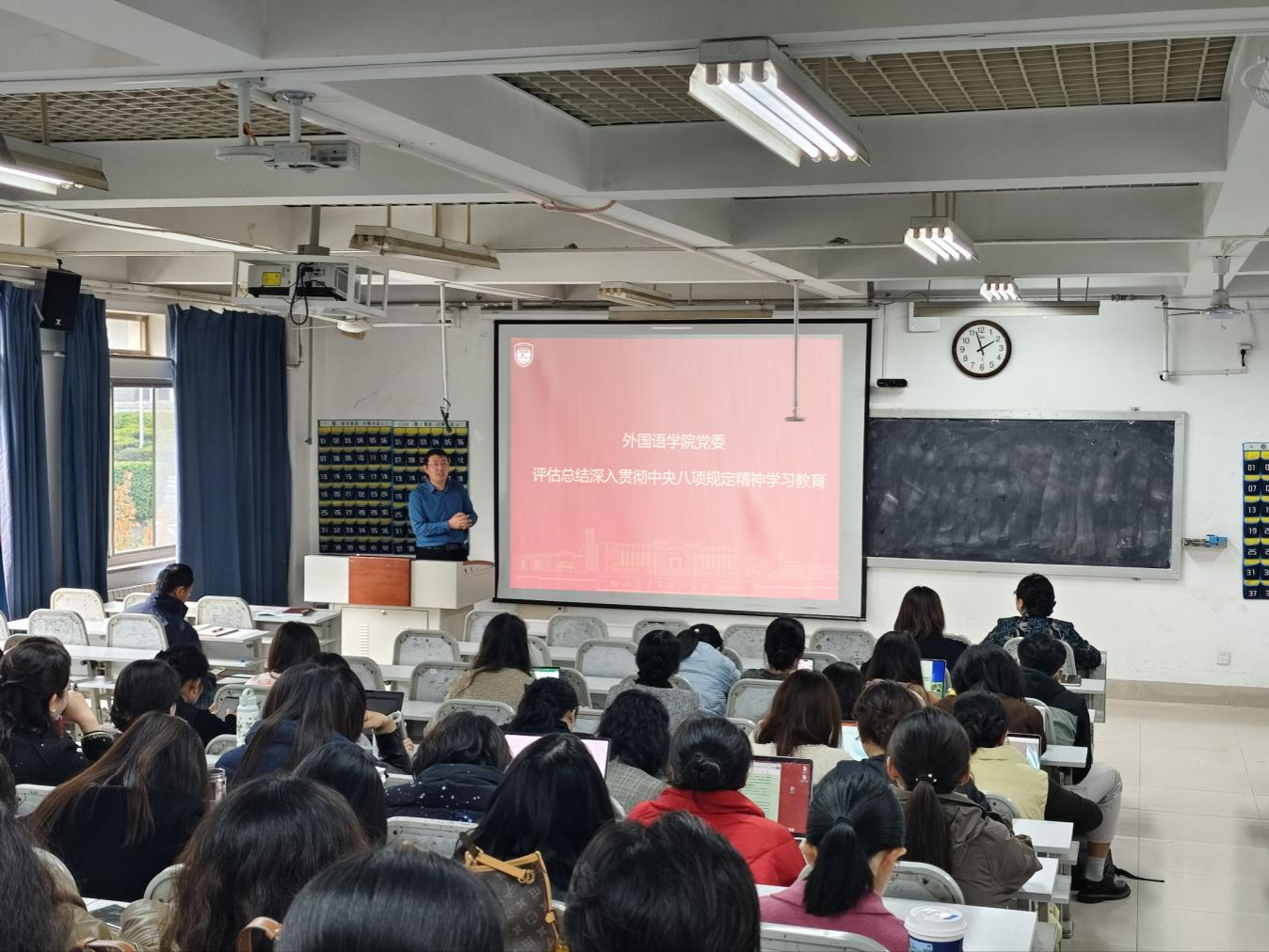 10月16日,外国语学院党委召开全体党员大会,专题总结评估深入贯彻中央八项规定精神学习教育工作。