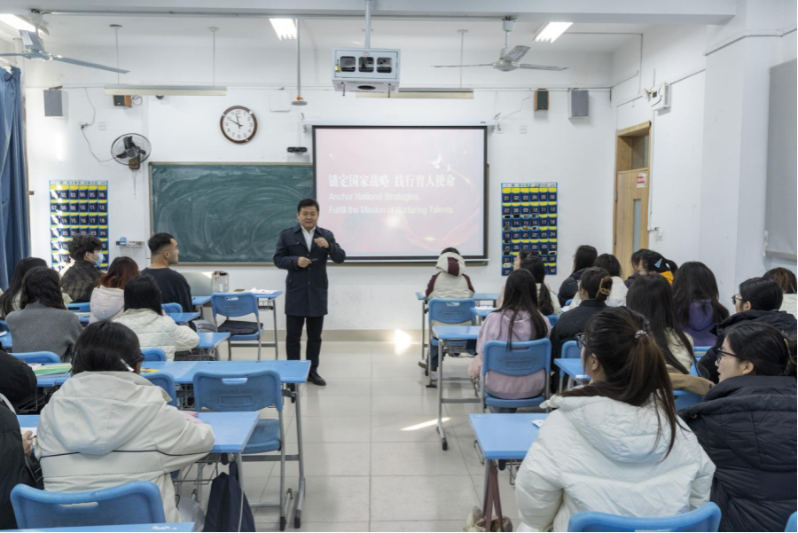为进一步解读党的二十届四中全会对教育事业的战略部署,结合外语学科特色与时代需求,为学生成长成才指明方向,12月5日,外国语学院院长邵光庆教授以《锚定国家战略,践行育人使命》为题,为学院学生带来一堂内涵丰富、形式新颖的双语思政课。