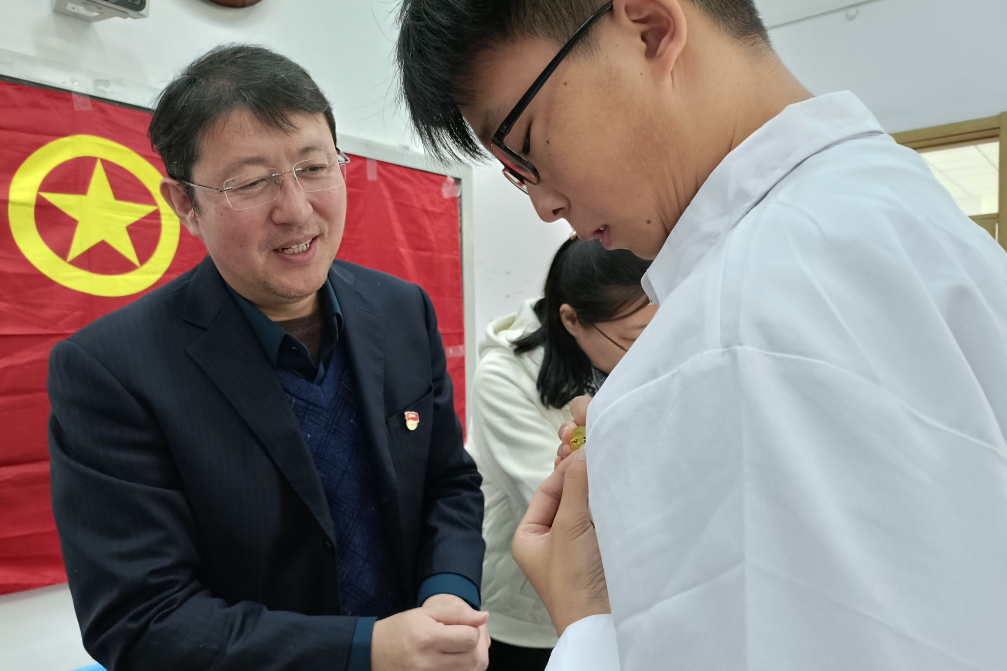 赵丽娟宣读《关于2025年下半年外国语学院发展新团员的决定》。与会领导、老师为每一位新团员颁发《中国共产主义青年团章程》、佩戴团员徽章。