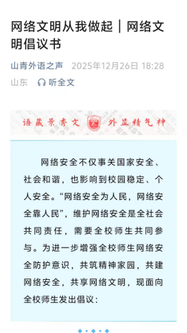 发起文明倡议,推动全员践行网络承诺。为引导全院师生将网络文明意识转化为实际行动,学院下发《网络文明倡议书》。倡议活动得到全院师生积极响应,大家主动学习倡议内容、践行倡议要求,定期开展网络言行自查,形成了“人人知晓倡议、人人践行文明”的良好氛围。师生网络言行更加规范,主动传播正能量的积极性显著提升,有效遏制了不良网络行为的发生,为构建安全、健康、文明的校园网络环境提供了有力保障。