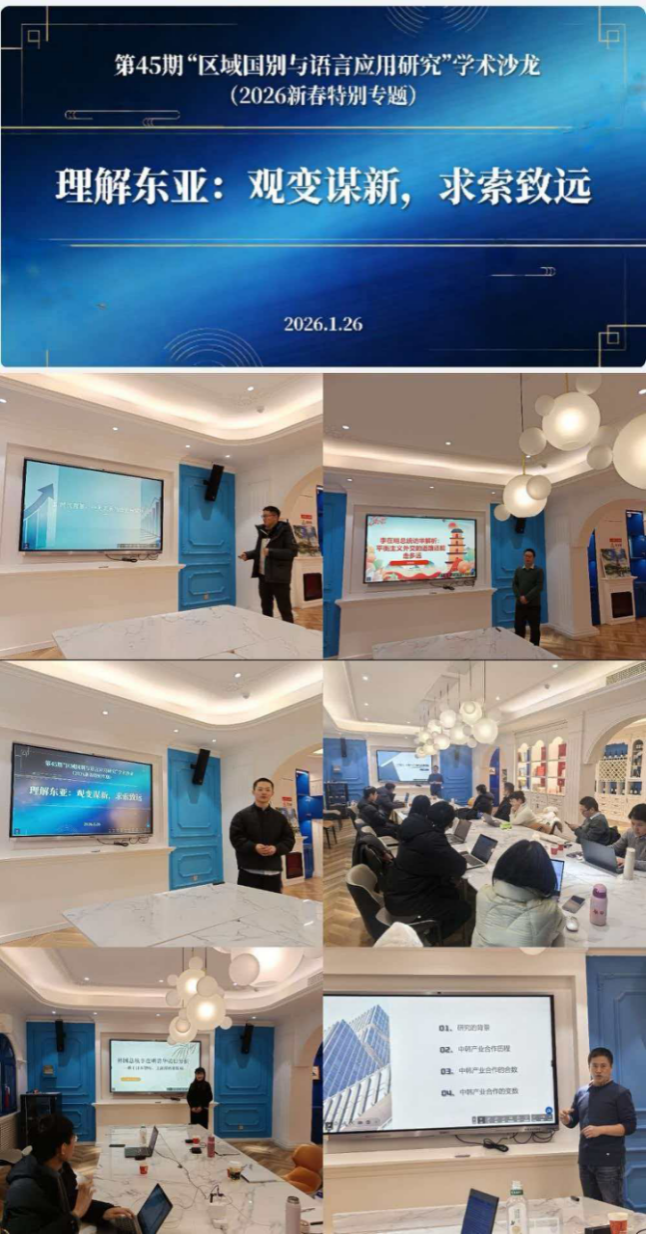 1月26日,外国语学院第45期“区域国别与语言应用研究”学术沙龙顺利举行。本次学术沙龙分上午场和下午场。上午场聚焦韩国总统访华、访日相关的各国智库和媒体评论展开讨论;下午场从党的二十届四中全会报告和“十五五”规划建议内容的学习开始,从中凝练出2026年度的课题和论文选题。外国语学院党委书记崔师锐、副院长管秀兰以及部分学术骨干参加沙龙活动。