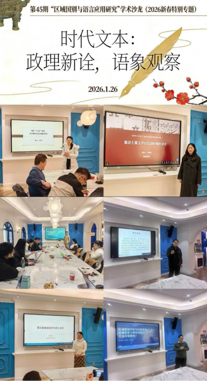 下午场主题为“时代文本:政理新诠,语象观察”,由日语教研室主任贾鹏飞副教授主持。丁逸群基于新闻框架理论考察了德国媒体对中国“十五五”规划的报道分析,阐述了共性基础框架、差异化框架及其成因分析,通过分析高频关键词、对比典型案例得出结论和启示;姚怡然基于“十五五”规划等时政文本,从民生、教育、区域与国别研究、人工智能等视角阐述了关于今后选题和研究热点的思考;王红芳梳理了语言基础设施的定义与形态、类型与特征,分析了服务于语言产业、教学和科研的语言基础设施的区域结构、功用与发展;尹田田介绍了德语“左翼文学”概念及其发展史,结合典型案例阐述了德语左翼文学在民国时期的译介情况;周书博概述了美国对委内瑞拉军事行动的事件梗概,分析了美国对委的法律叙事铺垫与法律战争逻辑,指出其将政治冲突转化为法律技术问题的实质,并分析美国对委军事行动的经济与地缘政治动机,论述了该事件对中国在委投资的影响并给出相应的应对建议;刘均国结合自身教学实践经验,阐述了围绕外贸领域开展区域与国别研究的新思考。