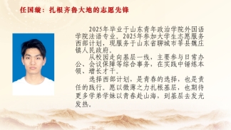 2025届法语专业毕业生任国璇,服务于山东省聊城市莘县魏庄镇人民政府。作为选择扎根家乡山东的基层一线工作者,他在给学院的寄语中写道:“选择西部计划,是青春的选择,也是责任的践行。愿以微薄之力扎根基层,也期待更多学弟学妹以青春赴山海,到基层去发光发热。”他结合在山东基层的服务实践,围绕本地专项政策、岗位适配性及基层工作技巧展开分享,参与日常办公、会议保障等综合事务,在实践中锤炼本领。为有意向留在省内服务基层的同学提供了精准指导,让大家看到西部计划“扎根乡土、服务家乡”的另一种可能。