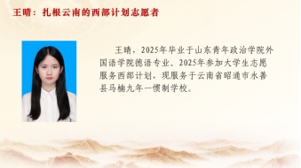 王晴,毕业于我院德语专业,2025年加入西部计划,现服务于云南省昭通市永善县马楠九年一贯制学校。分享会上,她用一张张照片带领同学们走进那个云雾缭绕的高寒山区。从初到服务地的不适应,到与当地孩子建立深厚情谊;从课堂教学的摸索,到课余时间翻山越岭的家访——她将半年多来的点滴经历娓娓道来。“这里的孩子们渴望知识,也渴望了解外面的世界。每当看到他们纯真的笑脸,我就觉得一切付出都值得。”王晴动情地说。她鼓励学弟学妹们勇敢走出舒适区,在基层的广阔天地中实现自我价值。