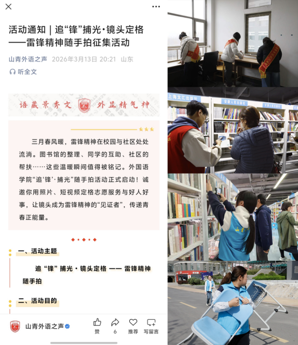 为深入传承和弘扬新时代雷锋精神,推动学雷锋志愿服务常态化、实效化走深走实,外国语学院以学雷锋志愿服务月为契机,开展形式丰富的学雷锋系列活动,广大青年学子以行动践初心,以服务暖人心,让雷锋精神在青春实践中绽放时代芳华。