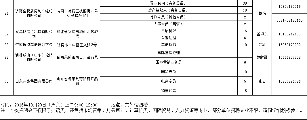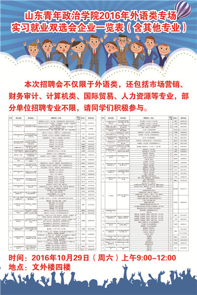 兹定于2016年10月26日(周六)上午9:00——12:00,在文外楼四楼举行外语类专场(含其它专业)实习就业双选会。本次双选会不仅限于外语类,还包括市场营销、财务审计、计算机类、国际贸易、人力资源等专业,部分单位招聘专业不限。