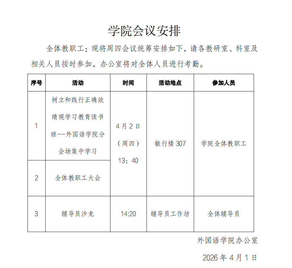 学院定于4月2日(周四)13:40在敏行楼307教室召开外国语学院全体教职工大会,望各位老师按时到会并相互转告。