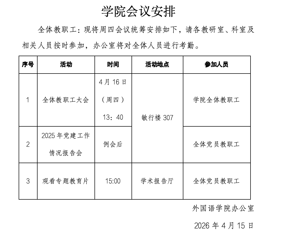 学院定于4月16日(周四)13:40在敏行楼307教室召开外国语学院全体教职工大会,望各位老师按时到会并相互转告。