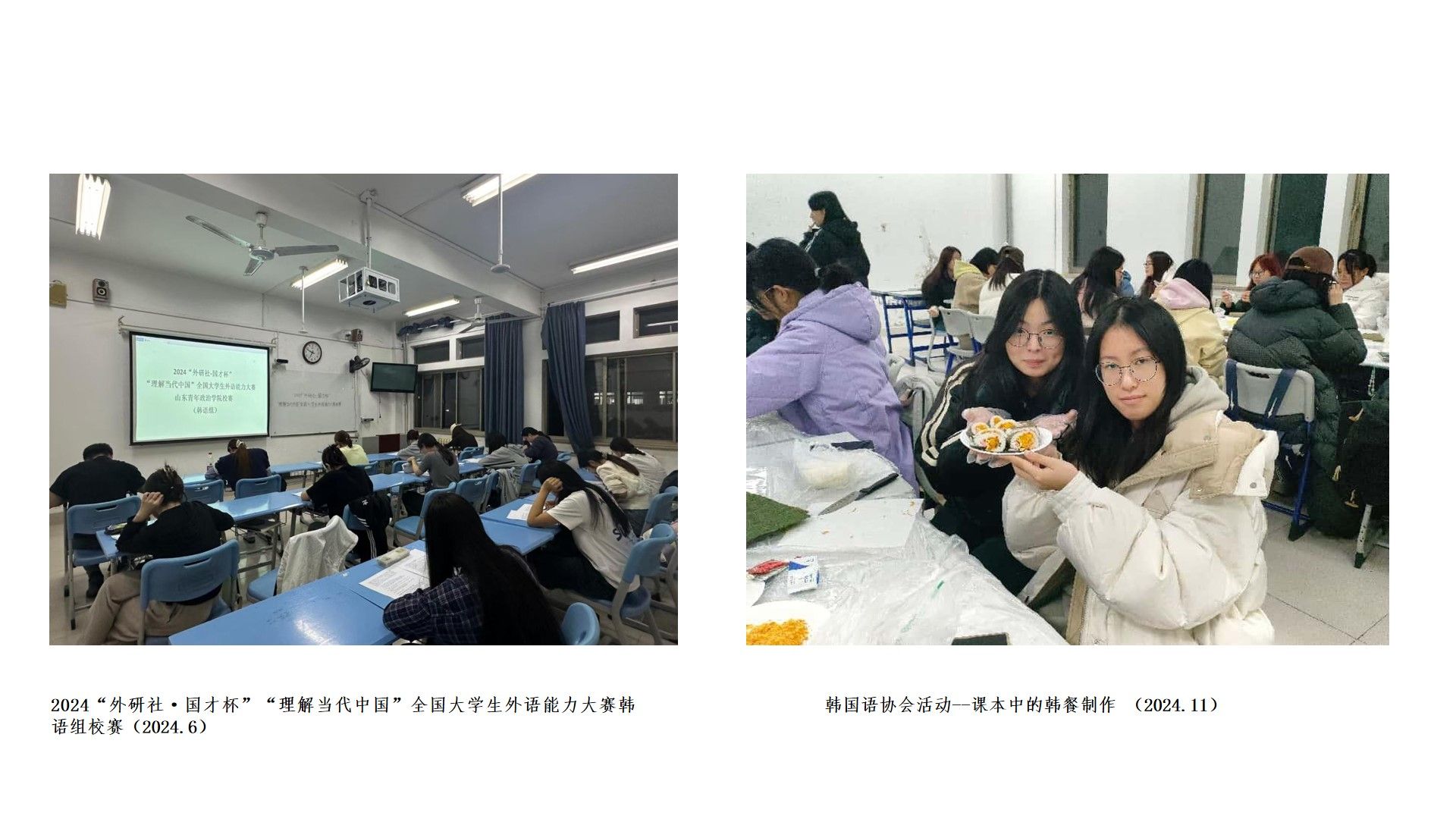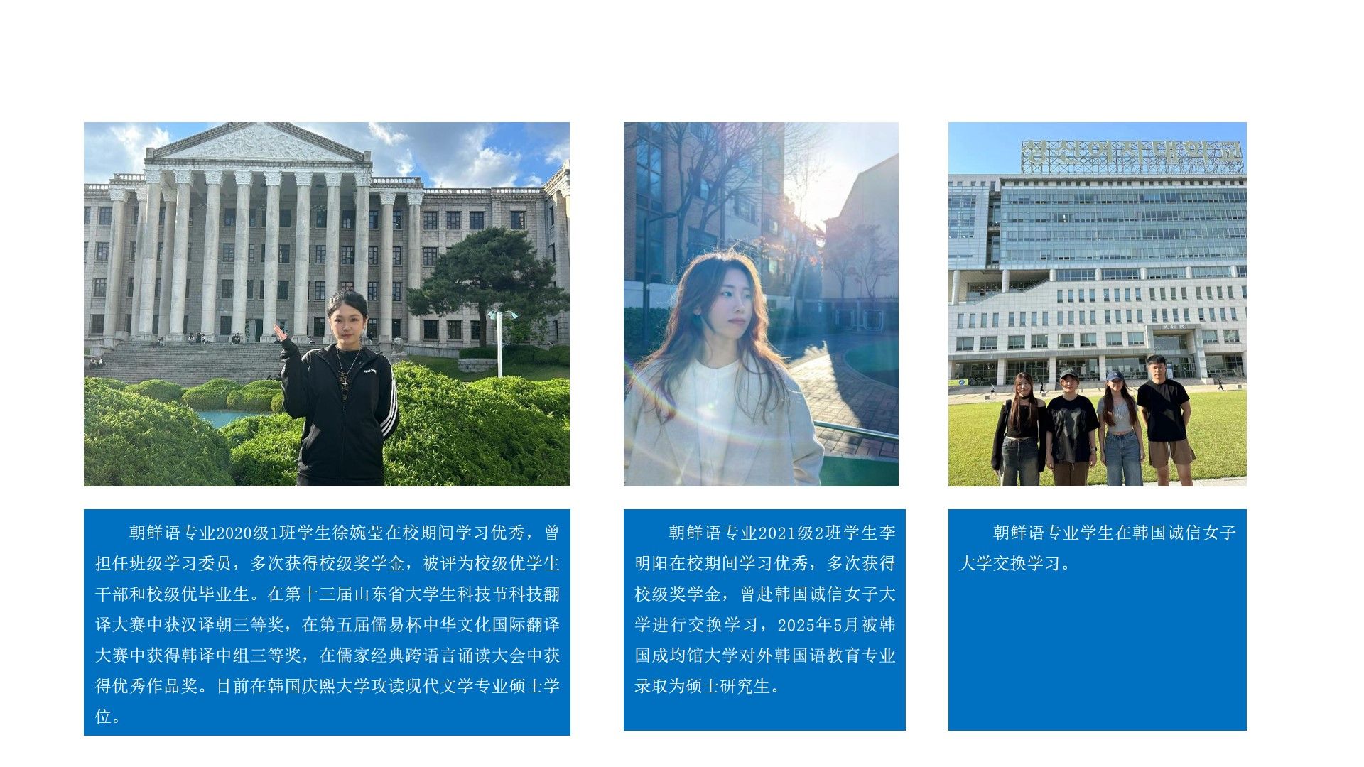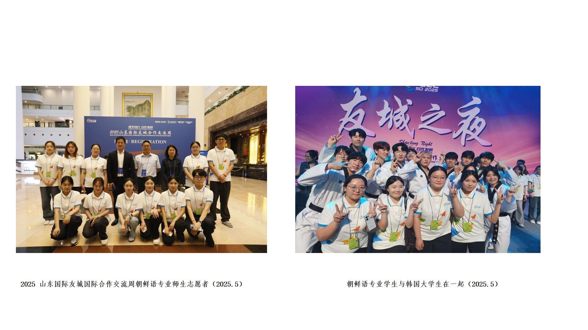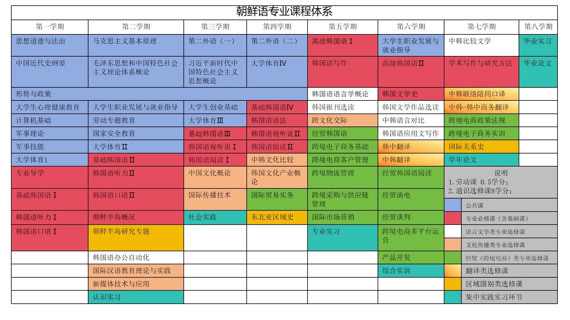 教师刘庆花(右)在韩国参加学术会议并发表论文 培养目标 本专业全面打造“朝鲜语+商务翻译”复合型人才培养模式,培养具有国际视野和人文素养,通晓国际规则,能够适应社会发展需要,服务地方经济,掌握扎实专业知识,具备综合竞争能力的国际化、多元化应用型朝鲜语人才。 专业必修主干课程 基础韩国语、韩国语写作、韩国语听力、韩国语口语、韩国语视听说、中韩翻译、韩中翻译、韩国文学史、韩国文学作品选读等。 专业选修主干课程 国际贸易实务、跨境电子商务基础、经贸韩国语、中韩-韩中商务翻译等。